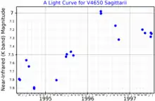 V4650 Sgr was first catalogued in 1996 as star 362 in a list of stars in the galactic centre region near the Quintuplet Cluster.[5] The acronym qF is used for stars in the list and so the star name is qF 362. The acronym FMM is also used, hence FMM 362.[6] The LBV nature of qF 362 was not recognised until 1999.[7] It is one of three LBVs close to the Quintuplet Cluster, all highly luminous stars.[8]