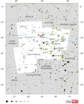 V4743 Sagittarii was a bright nova in the southern constellation of Sagittarius. This event was discovered by K. Haseda and colleagues in September 2002.[1] It peaked at magnitude 5.0[7] on September 20, 2002, then declined rapidly thereafter. It reached a peak temperature of 740,000 K around April 2003 and remained at that level for at least five months, suggesting the white dwarf component has a mass of 1.1–1.2 M☉.[8] The distance to this system is uncertain.[3] Infrared observations indicate a distance of approximately 21 kly (6.3 kpc).[4] A derivation using maximum magnitude rate of decay showed a distance of 12.7 ± 1.0 kly (3.9 ± 0.3 kpc).[8]