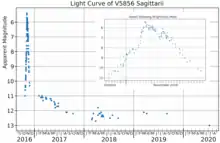 V5856 Sagittarii declined from peak brightness rapidly, fading by 2 magnitudes in 11.3 days, and 3 magnitudes in 14.5 days.[9] It is therefore classified as a "fast" nova in the classification scheme of Cecilia Payne-Gaposchkin.[10] The nova showed two peaks: a "fireball" peak corresponding to the freely expanding material ejected from the eruption and, nearly a week later, a second brighter peak coincident in time with the detection of γ-rays from the nova by Fermi-LAT. The fireball peak occurred at different times depending upon the wavelength of light being observed, but the second peak occurred at the same time for all wavelengths.[11]