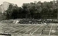 With the finished construction of Alumni Field in 1921, VMI football no longer needed to play on the Parade Ground situated in front of the barracks. The stadium was placed around the same place it is today, and was completed at a total cost of $69,000.[6] The Keydets went 3–5–1 in the stadium's inaugural year, which included key wins over in-state opponents Roanoke, Hampden–Sydney, and a stunning victory over Virginia.