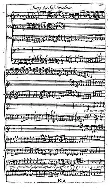 The horn, which was to feature prominently in 18th century compositions centred on dramatic themes of hunting or nobility, clearly symbolizes here the hunt, a recreation which was reserved for the wealthy and privileged. The virtuosic horn line (particularly difficult on the natural horn which did not have the valves available to the modern player) underlines this perspective.[12][13] The aria has been cited as a very early example of the horn's use in opera; audiences at the time of Giulio Cesare's premiere would not have expected to hear the horn used as a solo instrument.[6][14][n 1] Handel began to feature the horn in his 1708 serenata Aci, Galatea e Polifemo, and first used the horn as part of an opera orchestra in Rinaldo (1711).[15] The score of Giulio Cesare calls for four horns in the orchestra (although only one is used in this aria), and this would seem to be the first appearance in music of the 'horn quartet' which would become a standard feature of orchestral scores of the music of the romantic period a century later. The only other noted use by Handel of a horn obbligato in an aria occurs in his pastoral ode L'Allegro, il Penseroso ed il Moderato (1740), where the text, "Mirth, admit me", also refers to hunting.[16]