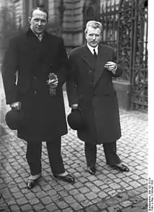 On 15 September 1930, only a day after the Reichstag elections, members of the Parliament of the Klaipėda Region submitted another complaint against Lithuania. This time they complained about Lithuania's interference in the local elections, such as press censorship, restrictions on freedom of assembly, promoting pro-Lithuanian bias within the electoral commission.[33] Sidzikauskas worked intensely negotiating directly with Germany in hopes that the complaint would be withdrawn. Lithuanians relented to many German demands, including appointment of all-German Directorate of the Klaipėda Region and less interference in the October 1930 local elections.[34] German Minister of Foreign affairs Julius Curtius kept pressuring Lithuanians to recall Klaipėda governor Antanas Merkys.[35] Sidzikauskas failed to resolve the conflict via direct negotiations and the complaint was discussed in the January 1931 session of the League of Nations.[36] The session was inconclusive and the issue was postponed.[37]