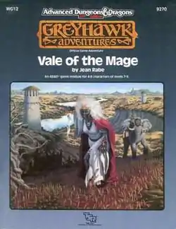 WG12 Vale of the Mage was the twelfth and last module in the World of Greyhawk line of adventures, published by TSR in 1989 as a 64-page booklet with an outer folder.[1] It was written by Jean Rabe, with interior art by Frey Graphics, David C. Sutherland III, and Valerie Valusek, and cover art by Roger Loveless.