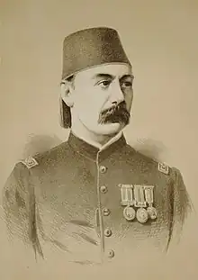 Two years later, having left England, he entered the service of the Ottoman Army in the war with Russia. At first in a high position in the Ottoman Gendarmerie he was soon transferred to Mehmed Ali Pasha's staff, and thence took command of a division of infantry. With this division, Baker sustained the rearguard action of Tashkessen against the troops of Gourko. Promoted Ferik (lieutenant-general) for this feat, he continued to command Suleiman's rearguard. After the peace he was employed in an administrative post in Armenia, where he remained until 1882. In this year he was offered the command of the newly formed Egyptian Army, which he accepted. On his arrival at Cairo, however, the offer was withdrawn and he obtained command only of the Egyptian police. In this post he devoted by far the greater amount of his energy to the training of the gendarmerie, which he realised would be the reserve of the purely military forces.[1]