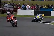 Rossi scored three pole positions in the next three races and finished second in France after battling with Gibernau, who overtook him on the last lap.[68][69] He won in Italy and came second again in Catalunya.[70][71] He took two third-place finishes at the Dutch and British rounds – the latter the result of a ten-second penalty for overtaking under yellow flags, gifting victory to Max Biaggi in the process – and another second place in Germany, once again battling Gibernau who denied him victory with just 0.060 seconds separating both when they crossed the finish line after a titanic battle between the two.[72][73][74]