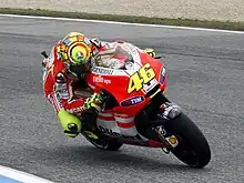 After graduating to the premier class in 2000, Rossi won the final 500cc World Championship (becoming the last satellite rider to win the top-class title to date) and the 8 Hours of Suzuka with Honda in 2001. He also won MotoGP World Championships with the factory Honda Team in 2002 and 2003 and continued his run of back-to-back championships by winning the 2004 and 2005 titles after leaving Honda to join Yamaha. He lost the 2006 title with a crash in the final round at Valencia. In 2007 he ultimately finished third overall, before regaining the title in 2008 and retaining it in 2009.[5] After a 2010 season marred by a broken leg and no title defence, he left Yamaha to join Ducati, replacing Casey Stoner for the 2011 and 2012 seasons, and endured two winless seasons with the Italian marque.[6][7]