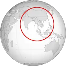 A Valeriepieris circle[1][2][3] is a figure drawn on the Earth's surface such that the majority of the human population lives within its interior. The concept was originally popularized by a map posted on Reddit in 2013, made by a Texas ESL teacher named Ken Myers, whose username on the site gave the figure its name.[4] Myers's original circle covers only about 6.7% of the Earth's total surface area, with a radius around 4,000 kilometers (2,500 mi) in length, centered in the South China Sea.[1] The map became a popular meme, and was featured in numerous internet media outlets.[5][6][7] Myers's original map uses the Winkel tripel projection, which means that his circle, not having been adjusted to the projection, does not correspond to a circle on the surface of a sphere.[8][9]