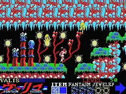 Gameplay varies depending on the platform, but each version retains the same basic plot; in the original MSX, PC-8801 and X1 versions, as well as the FM-7 and PC-9801 ports, Valis is a side-scrolling game where the player controls Yuko to fight through each level's enemies while jumping across ledges, exploring and searching for items and power-ups, before confronting a boss at the end of each level to increase Yuko's maximum health and attributes. At certain points in the game, gameplay pauses, and cinematic cutscenes play regarding the game's plot.[1][2] The Family Computer version differs considerably from the other versions, being more akin to a side-scrolling action role-playing game. It is a more difficult game due to its larger maze-style levels with multiple paths, and a lack of a password or save feature.[1]