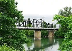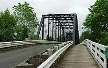Overall, the bridge is 708 feet (216 m) long and is composed of three separate steel spans that rest on concrete piers.[22][23] The swing span is a Pratt through truss, and the next longest part a 171-foot (52 m) long Parker through truss span on the western end.[22] The eastern approach is a Warren pony truss that measures 57 feet (17 m) in length.[22] There is also a 19-foot (5.8 m) long part on the far west end built of timber, which was originally a 57-foot (17 m) long steel pony truss.[22] The bridge has 15 feet (4.6 m) of vertical clearance and is 29 feet (8.8 m) wide, which includes a 7-foot (2.1 m) sidewalk and a 18.5-foot (5.6 m) roadway.[22]