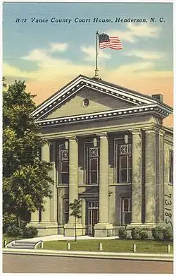 The former Vance County Courthouse is a historic courthouse building located at Henderson, Vance County, North Carolina, United States. It was originally built in 1884, before it was extensively remodeled in 1908 by Milburn, Heister & Company in the Neoclassical style. It is a two-story, tan brick, cross-plan building with a monumental front portico supported by brick columns.[2]