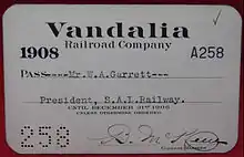 The Terre Haute & Indianapolis Railroad, the St. Louis, Vandalia & Terre Haute Railroad, the Terre Haute & Logansport Railway, the Logansport & Toledo Railway, the Indiana & Vincennes Railroad were all merged on January 1, 1905, to form the Vandalia Railroad Company. The railroad connected Indianapolis in the east with St. Louis in the west and South Bend and Butler in the north with Vincennes in the south.[2]