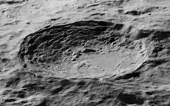 This is a relatively young impact that still retains the faint remnants of a ray system. Just outside the rim is a shadowed area, with the rays beginning about one-third of a crater diameter distant. The faint rays extend for several crater diameters in all directions.