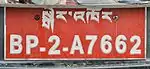 The current license plate for private vehicles in Bhutan is composed of letters and digits in the BP-N-ANNNN format. The letters are written in white on a red license plate. The first two letters for private vehicles are BP This is followed by a digit signifying the region in which the vehicle is registered. Then a letter from A-Z is followed by four digits running in sequence like 1234. So for example a car registered in Thimphu could have the number BP-1-A1234.