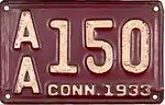 1933 | Embossed white serial on maroon plate; "CONN. 1933" at bottom | 1234 | Issued in blocks by branch office | |