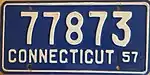 1957 | Embossed white serial on blue plate with border line; "CONNECTICUT" at bottom, offset to left | none | 12345 | 1 to 99999 | In the two-letter serial formats, serials with C or D as the first letter were reserved for Combination and Used Dealer plates respectively. |