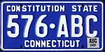 Embossed dark blue serial on reflective gradient sky blue and white plate with dark blue border line; "Connecticut" screened in dark blue centered at top; screened dark blue state shape at top left | "Constitution State" screened in dark blue centered at bottom | 123·ABC2 | 100·NZN to 999·ZZX | 'O' series not used; 'V' series reserved for Veteran plates. |