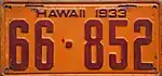 1933 | Embossed red on orange; "HAWAII 1933" centered at top | 12-345 | Issued in blocks by county | |