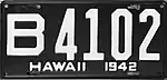 1942–45 | Embossed white on black; "HAWAII 1942" centered at bottom | A1234 | County-coded | Revalidated for 1943, 1944 and 1945 with windshield stickers, due to metal conservation for World War II. |