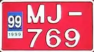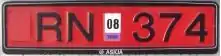 Temporary RN 123 Reflective red background, black frame, and black characters Mainly used by dealers. This type of plates always starts with RN, the sticker indicates the validation year of the plate.