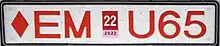 Commercial (VAT-Free) AB 123 or AB C12 Reflective white background, red frame, red characters with diamond. Vehicles with commercial plates cannot be used for private purposes, denoted by a diamond in front of number. VAT deductable if vehicle meets certain requirements.