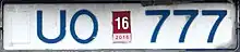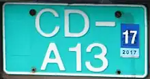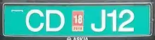 New registered plates use three letters and two digits (e.g. ABC12) in Helvetica Neue. Prior to 2007, the format AB 123 was used (and are still valid), however no new plates are issued in this format. The plates are issued randomly, they are not issued sequentially and they do not have any geographic coding. Vehicles keep the same registration number for life. If a vehicle is, e.g., changed to commercial vehicle it gets commercial plates but they have the same registration number. All plates have validation stickers in the middle that indicate the year the vehicle is due for safety inspection.[1]