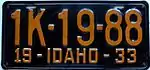 1933 Embossed orange serial on black plate; "19 - IDAHO - 33" at bottom none 1A-12-34 Coded by county of issuance (1A)