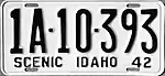 1942–44 Embossed dark blue serial on white plate; "42" at bottom right "SCENIC IDAHO" at bottom, offset to left 1A-12-345 Coded by county of issuance (1A) Revalidated for 1943 and 1944 with windshield stickers, due to metal conservation for World War II.