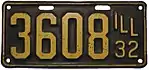 1932 | Golden yellow on dark blue with border line; "ILL 32" at right | none | 1-234-567 | 1 to approximately 1-301-000 | |