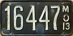 1913 Embossed white serial on dark blue plate; "MO 13" at right 12345 1 to approximately 36000