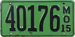 1915 Embossed black serial on bright green plate; "MO 15" at right 12345 1 to approximately 73000