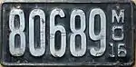 1916 Embossed white serial on black plate; "MO 16" at right 123456 1 to approximately 103000
