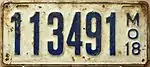 1918 Embossed blue serial on white plate; "MO 18" at right 123456 1 to approximately 185000