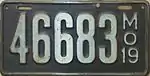 1919 Embossed white serial on dark blue plate with border line; "MO 19" at right 123456 1 to approximately 243000