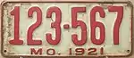1921 Embossed red serial on white plate with border line; "MO. 1921" centered at bottom 123-456 1 to approximately 350-000