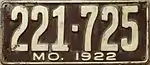 1922 Embossed white serial on brown plate with border line; "MO. 1922" centered at bottom 123-456 1 to approximately 355-000