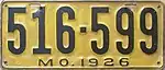 1926 Embossed black serial on yellow plate with border line; "MO. 1926" centered at bottom 123-456 1 to approximately 595-000