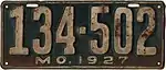 1927 Embossed white serial on dark blue plate with border line; "MO. 1927" centered at bottom 123-456 1 to approximately 606-000