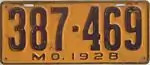 1928 Embossed purple serial on orange plate with border line; "MO. 1928" centered at bottom 123-456 1 to approximately 631-000