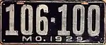 1929 Embossed white serial on black plate with border line; "MO. 1929" centered at bottom 123-456 1 to approximately 662-000