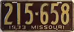 1933 Embossed beige serial on brown plate with border line; "1933 MISSOURI" at bottom 123-456 1 to approximately 598-000