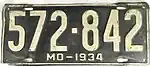 1934 Embossed white serial on black plate with border line; "MO–1934" centered at bottom 123-456 1 to approximately 627-000