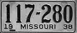 1938 Embossed black serial on buff plate with border line; "19 MISSOURI 38" at bottom 123-456 1 to approximately 715-000
