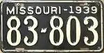 1939 Embossed buff serial on black plate with border line; "MISSOURI-1939" at top 123-456 1 to approximately 731-000