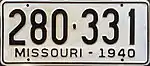 1940 Embossed black serial on white plate with border line; "MISSOURI-1940" at bottom 123-456 1 to approximately 767-000