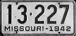 1942–43 Embossed black serial on white plate with border line; "MISSOURI-1942" at bottom 123-456 1 to approximately 820-000 Embossed plates revalidated for 1943 with green tabs due to metal conservation for World War II; fiberboard plates manufactured for the same reason.