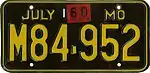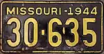 1944 Embossed yellow serial on black plate with border line; "MISSOURI-1944" at top 123-456 1 to approximately 696-000
