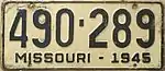 1945 Embossed black serial on buff plate with border line; "MISSOURI-1945" at bottom 123-456 1 to approximately 697-000