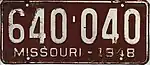 1948 Embossed white serial on maroon plate with border line; "MISSOURI-1948" at bottom 123-456 1 to approximately 871-000