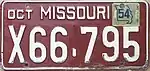 1949–54 Embossed white serial on maroon plate with border line; "MISSOURI" centered at top; month of expiration at top left 123-456 1 to