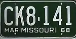1967 Embossed white serial on green plate with border line; month of expiration, "MISSOURI" and "68" at bottom none AB1-234 First letter corresponds to month of expiration